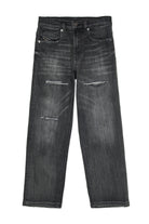 D-Maki relaxed fit jeans in dark gray denim with rips with a street attitude. A relaxed oversize silhouette from comfortable waist to ankles, soft on the leg. Inspired by the '90s, the loosest jeans in the DIESEL collection.
