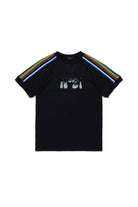 Soft cotton jersey T-shirt with multicolor bands along the sleeves. The contrast between the shiny logo print and sporty details makes the garment perfect for everyday looks.