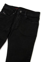 Five-pockets jeans with skinny fit and punk attitude. Low waist. Made of soft-handed black denim. Featuring a contrasting color embroidered "D" logo on the back pocket. The design features an adjustable waistband and elastic closure.