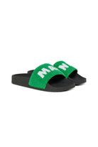 Modern design slide slippers. Terrycloth upper with maxi Marni! logo embroidered in contrasting colour. Polyurethane sole. Made in Italy.