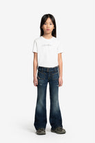 D-Eki bootcut fit jeans in dark blue denim with abrasions with a pop attitude. A model that hugs the body from hips to knees with a wide flared bottom. A retro style that gets a makeover: perfect with contemporary sneakers for a modern twist on the classic bootcut.