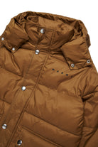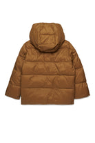 Padded hooded jacket, ideal for colder days. Front button pockets and contrasting color institutional logo add distinctive details, making it a recognizable garment perfect for the winter season.