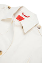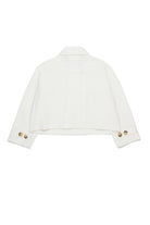 Cropped double-breasted jacket with embroidered logo on the cuff. The design features structured shoulders, buttons on the shoulders, and a front closure.