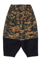 Oversized chinos inspired by the American navy. Balloon fit with drawstring at the ankles and front darts at the waist, in pixel camouflage fabric with calf-height cut detail and black contrast.