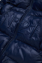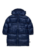 Long padded jacket with asymmetrical bottom, featuring a modern and functional design. The tone-on-tone embossed logo N°21 appears on the front at pocket height, adding an elegant and discreet touch.