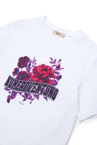 Short-sleeved T-shirt in soft cotton jersey, enhanced by a pixelated-effect floral graphic on the front. The print's irregular finish, reminiscent of an ink drawing, adds a contemporary touch to the look.