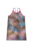 Cover-up with logo and multicolor animal print, finished with contrasting trim. The model features a mini silhouette and crossed straps on the back.