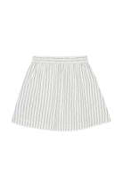 Short skirt with logo and vertical stripe pattern. The garment features an A-line silhouette and stitching details on the waistband.