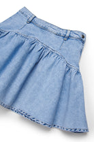Short denim skirt with gathered flounce. A garment with a modern look thanks to exposed stitching and a flared design.