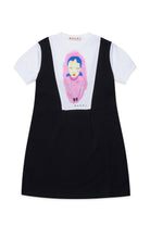 Short dress with logo and front print. Model featuring an integrated short-sleeved cotton t-shirt, characterized by a contrasting panel and an A-line silhouette.