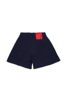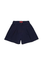Formal-cut shorts with front pleats, featuring belt loops at the waist and a logo patch on the back.