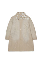 Trench coat with printed logo, knee length, and paint splatter effect print. The signature back stitching gives the piece its distinctive character.