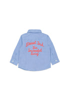 Shirt with embroidered logo and patch pocket on the chest, featuring decorative lettering on the back.