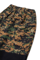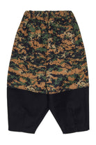 Oversized chinos inspired by the American navy. Balloon fit with drawstring at the ankles and front darts at the waist, in pixel camouflage fabric with calf-height cut detail and black contrast.