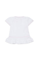 • Embroidered logo on the chest, contrasting trims, and ruffled hem