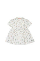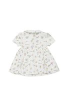 Short dress with all-over logo and floral print, featuring a rounded collar and short sleeves.