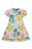 Short dress with logo and oversized multicolor floral print. The silhouette is flared with a waist seam and gathered short sleeves.