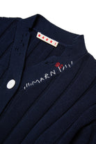 Long-sleeved ribbed knit cardigan with localised rips. Marni Flower logo in contrasting color on the collar. Front button closure. Made of 100% cotton.