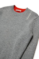 Long-sleeved crew-neck pullover in wool blend, featuring an original colorblock design with contrasting construction: shaved knit on the front and ribbed knit on the back. The hand-embroidered Marni Handmade logo on the shoulder adds a handcrafted detail, enhancing the uniqueness and quality of the garment.
