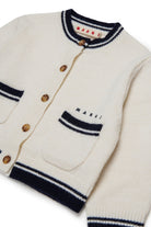 Long-sleeved wool-blend knit cardigan embellished with front pockets and contrasting details on the crew-neck, cuffs and bottom, enhancing the design. A refined and versatile garment.