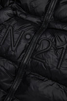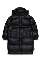 Long padded jacket with asymmetrical bottom, featuring a modern and functional design. The tone-on-tone embossed logo N°21 appears on the front at pocket height, adding an elegant and discreet touch.