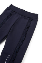 Fleece jogger pants embellished with a ruffle detail along the leg and institutional logo in contrasting color on the bottom. A garment that combines comfort and femininity, perfect for an original casual look.