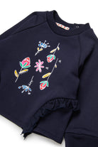 Long-sleeved crew-neck sweatshirt features colorful and vibrant graphics on the front with the Marni logo integrated into the print. Applied ruffles on the sides add a feminine touch, making this garment perfect for an original look full of personality.
