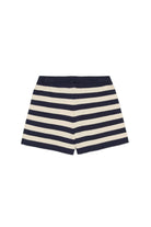 Striped knit shorts with logo. A casual garment featuring horizontal stripes and an elastic waistband.