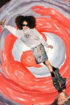 Tight-fitting short skirt made of shiny-effect stretch fabric. Acid Rain allover digital print, enhanced by the application of transparent and shimmering studs, gives a bright and unique drop effect.