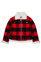 Long-sleeved shearling-type jacket in soft plaid flannel with teddy inner. A mix of comfort and character, with utility pockets and the horror-themed logo on the back.