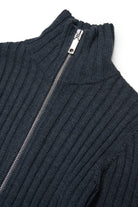 High-necked cardigan in ribbed wool-blend knit. Warm and practical with a front zipper closure, it is enhanced by a patch and a front slit that lightens the line.