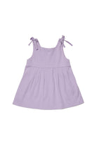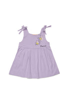 前面にロゴとフローラル刺繍が施されたショートドレス。肩紐は結びデザインで、スカート部分には軽いギャザーがあります。