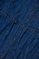 長袖ミドルブルーデニムショートドレス。ゆったりしたドローストリングウエストでフィットの調節が可能です。