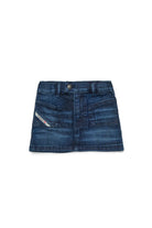 濃紺の着古したような風合いのデニムのショートスカート。カジュアルでありながら洗練された装いに最適で、さまざまなスタイルに合わせやすい。
