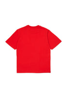 フロントに縦型のマキシロゴプリントが施されたTシャツ。