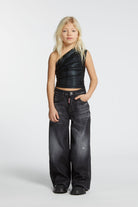 濃淡のあるブラックのレギュラーフィットのトラベラー・ジーン・ジーンズ。ウエストはフィットし、太ももから足首にかけては柔らかく、裾はワイド。着古したような風合いのデニムは、どんな装いにも個性を与えてくれる。