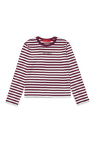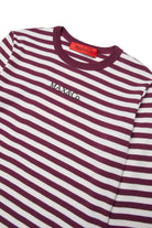 先染めコットン製のストライプ・マイクロリブの長袖Tシャツ。フロントにプリントされたラバー加工ロゴを引き立てるミックスカラー。