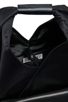 ポケット付きジャパニーズバッグ。三角形のシルエットが特徴。カラートーンの数字ロゴ入りフロントポケット。合成皮革の袖。ボタン留め。背中にアイコニックな縫い目。MM6を象徴するアクセサリーをアダルトコレクションから再解釈。寸法:高さ31.5cm、長さ44cm。袖丈:20cm