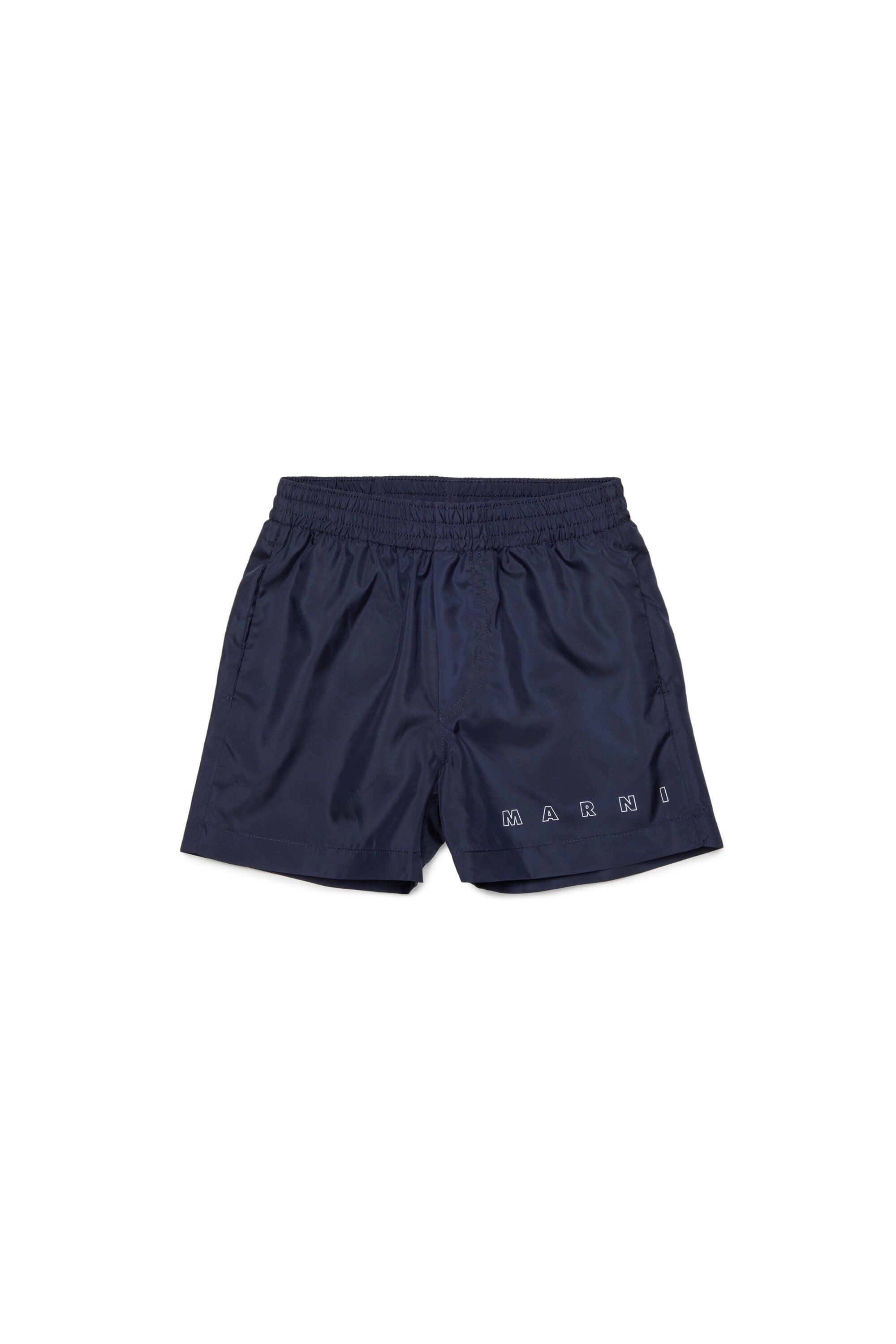 ポリエステルボクサー水着。ミディ丈。ウエストゴム部分。フロントにコントラストカラーのMarni Outlineロゴ入り。インナーブリーフ。フロントにウェルトポケットとバックポケット。