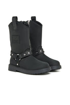 スタッズ・ストラップ付きのレザー製バイカー・ブーツ。プリントのサイドラベルがルックスを引き締め、ロックスタイルのブーツをお探しの方にぴったり。