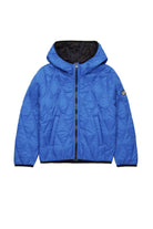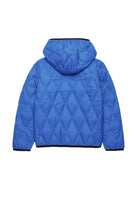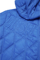 フェイクダウンの長袖パッド入りジャケット。フード付き。ナイロンにDiamondパターンの3本針キルティング。フロントのハートサイドにアイコン的オーバルDロゴパッチ。背面にトーン・オン・トーンで刺繍されたDIESEL For Successful Livingロゴ。ジップクロージャー。前面にウェルトポケット。コントラストカラーのインナー。