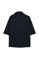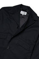 ロゴとアイコニックなバックステッチが特徴のシングルブレストコート。ワイドカラーと斜めのフロントポケットを備えたミニマルなデザインのモデル。