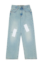 ライトデニムのレギュラージーンズ。軽いユーズド加工のアブレーションと脚部分に装飾パッチ付き。