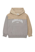 フーディー。肩と袖にコントラストパネルが施され、胸元に大きなロゴプリントが特徴です。
