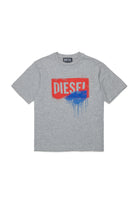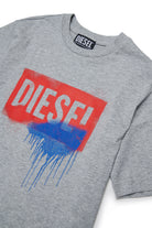 胸元にペイントが垂れたようなロゴが施された、100%コットンのTシャツ。