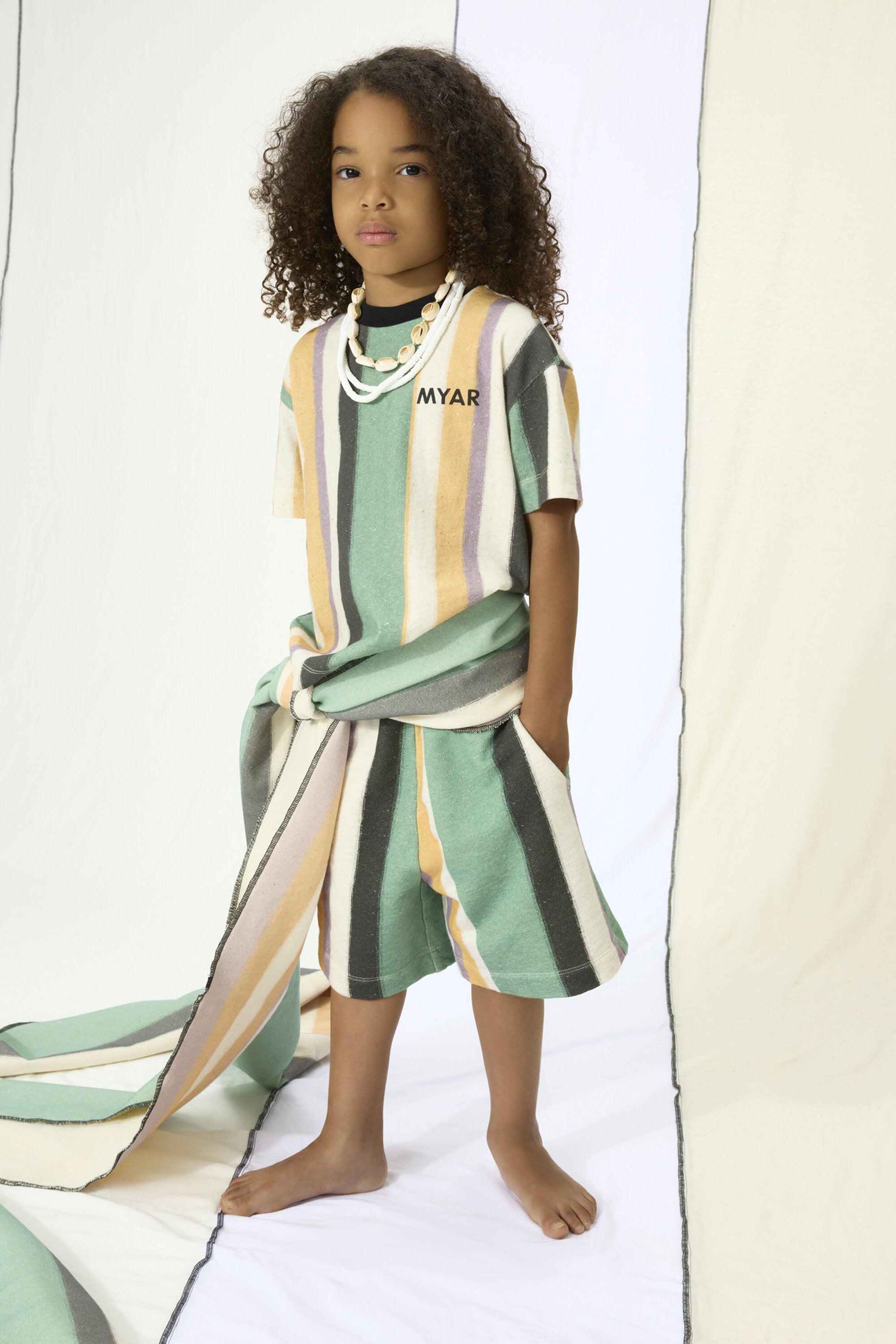 100%コットンのTシャツ。ロゴ入り、縦縞プリント。