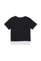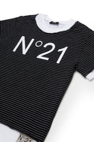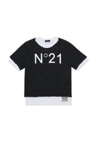 N°21ロゴ入りストライプTシャツ。ダブルレイヤーデザインとコントラストディテールが特徴です。