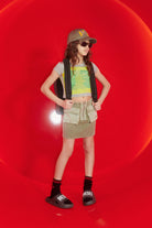 ロゴ付きミニスカート、フロントに大型ポケット付き、リブ加工。