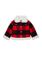 ソフトなチェック柄のフランネルを使用した、テディ・インナー付きの長袖シャーリング・タイプ・ジャケット。快適さと個性がミックスされ、ユーティリティ・ポケットとホラーをテーマにしたロゴが背中にあしらわれている。