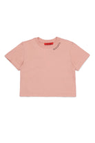 肩にロゴプリントが施された100%コットンのTシャツ。デザインはクロップドシルエットと半袖で、今風でカジュアルなスタイルを演出します。